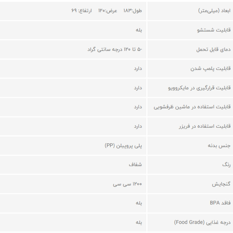 سایر توضیحات دارای تاییدیه سیب سلامتقابلیت استفاده در مایکروویو ، فریزر و ماشین لباسشوییدمای قابل تحمل -۵ تا ۱۲۰ درجه سانتی گرادقابلیت چیدن روی یکدیگرقابلیت پلمپ شدنتعداد درب = تعداد ظروفرنگ شفافنگه داری مواد گرم سرد